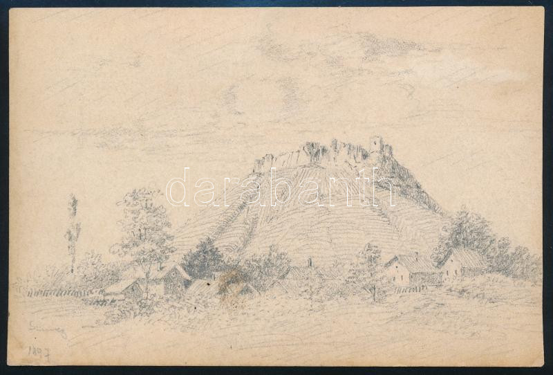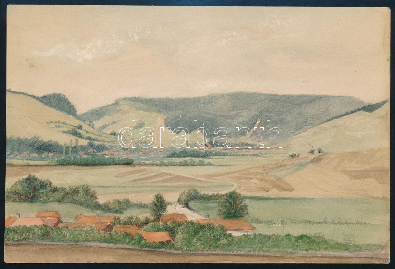 Beschreibung: 1894 Az erdélyi Székelyföldön található Olasztelek község látképe Vargyas felől, akvarell, feliratozva, 11×16,5 cm
