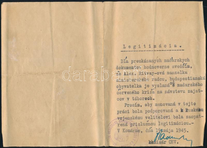 1945.V.11. Komárom (Komárno)-Győr, a Magyar Vöröskereszt Országos központjának kutatóirodája által fogolytábor látogatására kiküldött személy (Ritvay Sándor miniszteri tanácsos felesége) részére kiállított igazolvány, magyar, szlovák és orosz nyelven; Győr, Moson és Pozsony közigazgatásilag egyelőre egyesített vármegye főispánjának aláírásával, bélyegzőjével