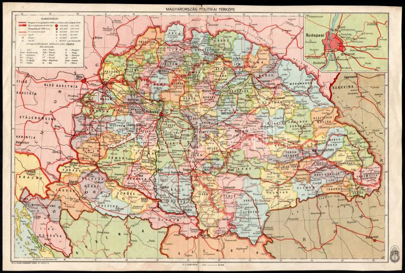 1942 Magyarország politikai térképe a visszacsatolt területekkel, M. Kir. Honvéd Térképészeti Intézet. 27x41 cm, 1:2.500.000. Lapszéli apró foltokkal, kisebb javítással.