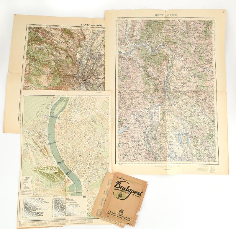 cca 1914-1930 3 db régi Budapest-térkép: Kogutowicz: Budapest székesfőváros térképe, Bp., Magyar Földrajzi Intézet Rt., 12 p.+1 t., sérült, szétvált + Budapest és környéke, 1 : 75.000 és 1 : 200.000, M. Kir. Állami Térképészet, kis lapszéli sérülésekkel, 62,5x47 cm és 65x48 cm