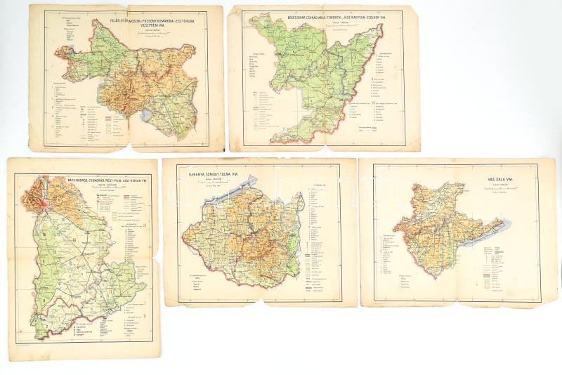 Beschreibung: cca 1920-1940 5 db vármegye térkép, tervezte: Dr. Kéz Andor, 1 : 800.000, Bp., Révai Offset-ny., lapszéli sérülésekkel, 32,5x24,5 cm