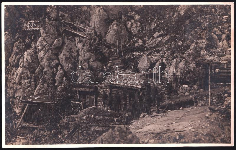 cca 1917 A cs. és kir. 105. gyalogezred (K.u.K. Infanterie-Regiment 105.) V/44. zászlóaljának katonái, a szurdok sziklái közé épített fedezékekkel, épületekkel (Erdély, Hagymás-hegység, Békás-szoros közelében), I. világháborús fotó, a hátoldalon feliratozva, 13x8 cm