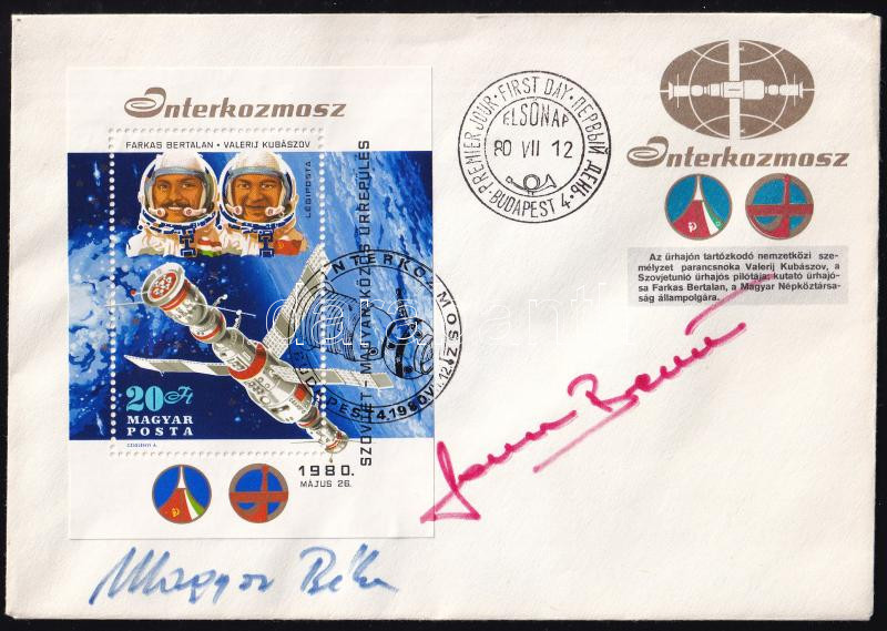 1980 Szovjet-Magyar közös űrrepülés FDC Farkas Bertalan (1949-), és Magyari Béla (1949-2018), űrhajósok aláírásával / Intercosmos FDC with original autographs of Hungarian astronauts