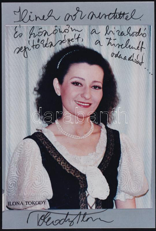 Beschreibung: Tokody Ilona (1953- ) Kossuth- és Liszt Ferenc-díjas opera-énekesnő (szoprán) autográf aláírása és sorai őt ábrázoló fotón, 15x10 cm