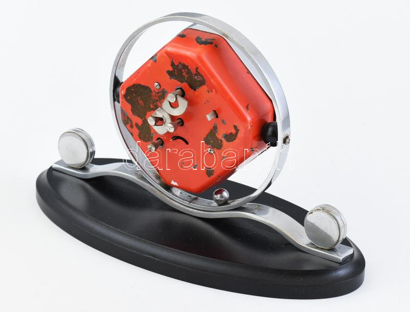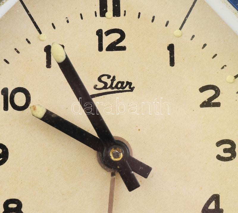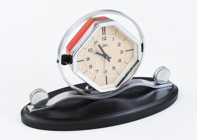 Art deco óra ovális fa talpon, körbe foglalva,krómozott kerek diszitőelemekkel, 8-szögletű ,,Star" ébresztős óraszerkezet,jár!,Piros házban, minden alkatrésze megvan,korának megfelelő kopásokkal. 23x15 cm