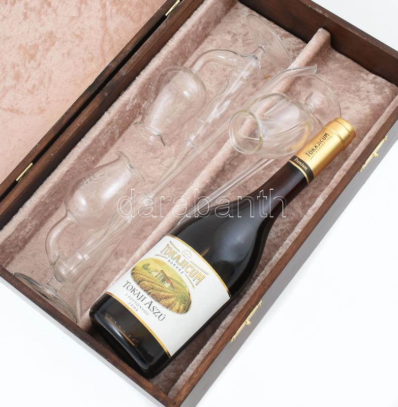 Beschreibung: Tokajicum 3 puttonyos fehérbor, bontatlan palack, díszdobozban, 3 db pálinka kóstoló üveg pohárral