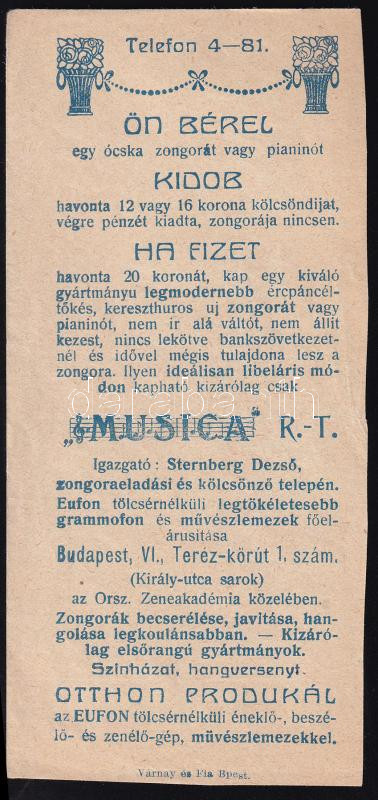 Musica Rt. zongorabérlés számolócédula https://www.darabanth.com/de/436-Fernauktion/436.0/Kunst-Dokumente-andere-Sammelgebiete/Werbungen~500022/Musica-Rt-zongoraberles-szamolocedula~II2827278