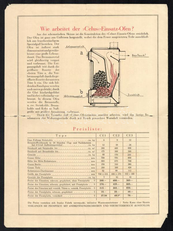 Beschreibung: cca 1910-1930 "Celus" Einsatz-Ofens für Stein- und Braunkohle, széntüzelésű kályha reklámlap, kétoldalas, német nyelvű, lapszéli szakadásokkal