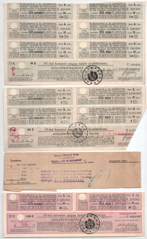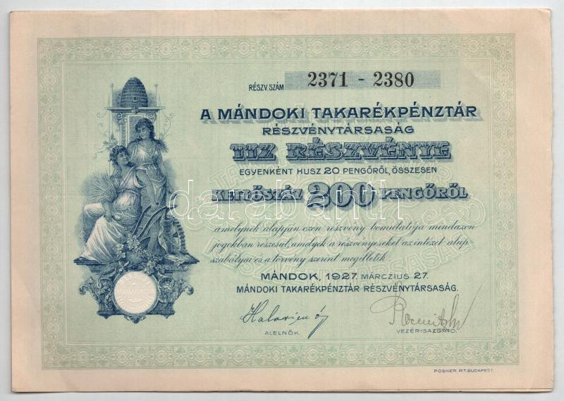 1927-1941. 4 darabos magyar részvény tétel, illetve szelvények berakóban, közte "Vármegyei Bank és Takarékpénztár Zalaegerszeg", "Állami Nyereménykölcsön", "Mándoki Takarékpénztár", zömmel I--II- állapot, illetve a "Vármegyei Bank és Takarékpénztár Zalaegerszeg" III állapotban