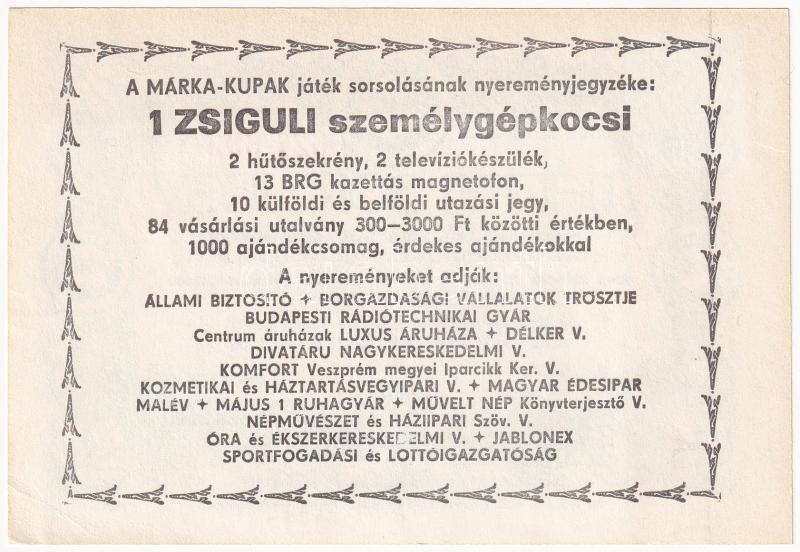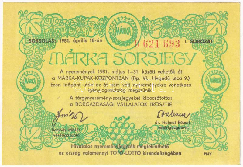 1981. "Márka Sorsjegy" I. sorozat, "0 621 693" sor... https://www.darabanth.com/de/436-Fernauktion/436.0/Numismatik/Aktien-und-Tickets~1500005/1981-Marka-Sorsjegy-I-sorozat-0-621-693-sorszamu-sorsjegye-TI-kis-sarokhajlas~II2827456