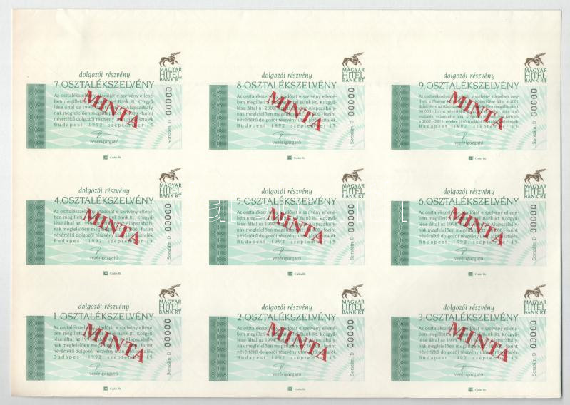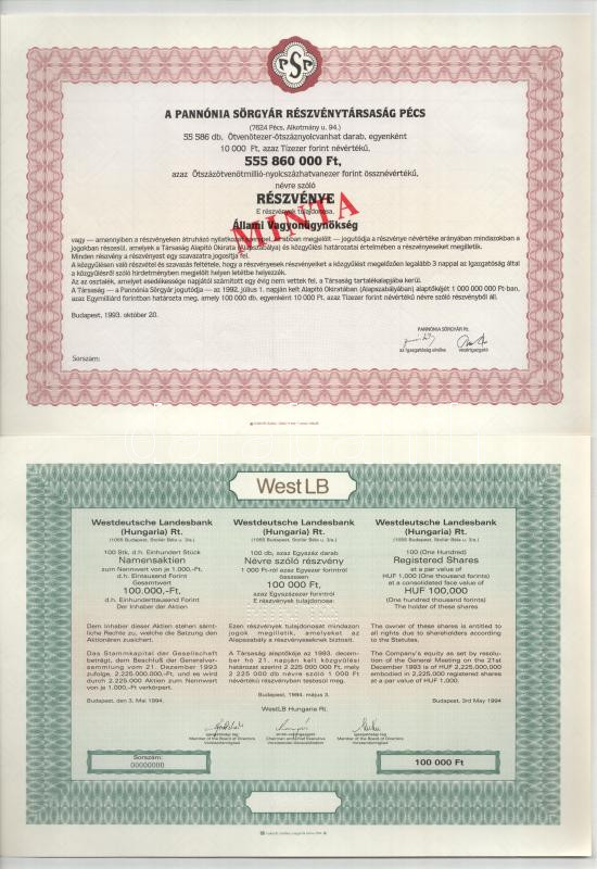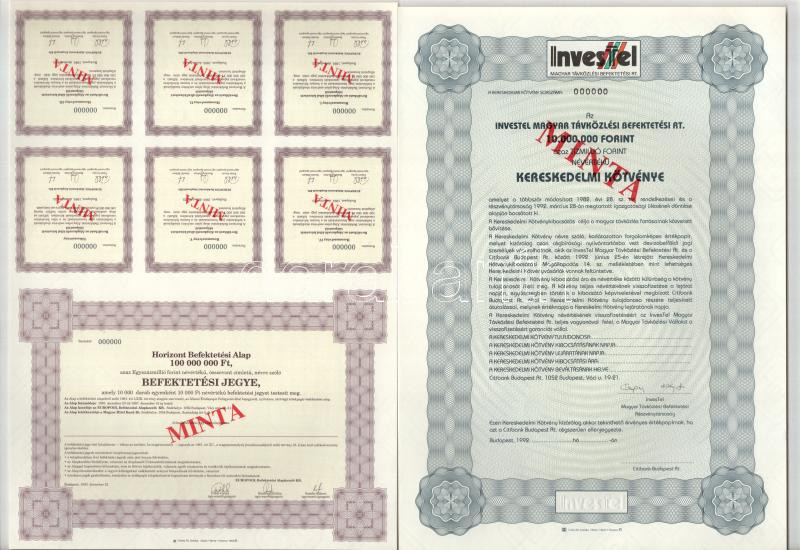 1992-1994. 5 darabos magyar részvény tétel: "Horizont Befektetési Alap", "Investel", "Pannónia Sörgyár", Magyar Hitel Bank", "West LB", közte vízjeles papír, szárazpecsét, perforáció, szelvények T:I-,II