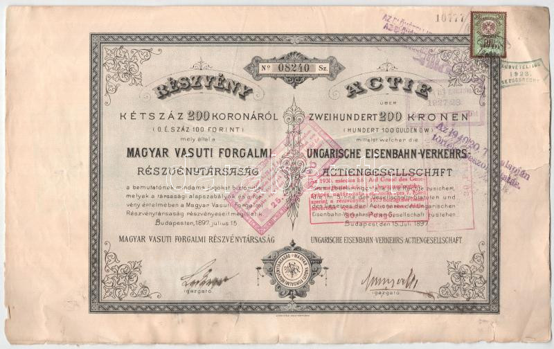 Beschreibung: Budapest 1897. "Magyar Vasuti Forgalmi Részvénytársaság" részvénye 200K-ról, szelvényekkel, bélyegzésekkel, osztrák okmánybélyeggel T:III szakadás