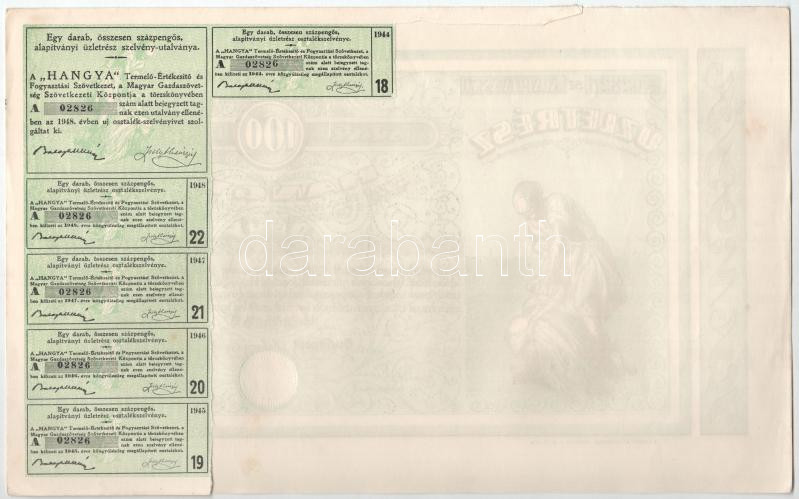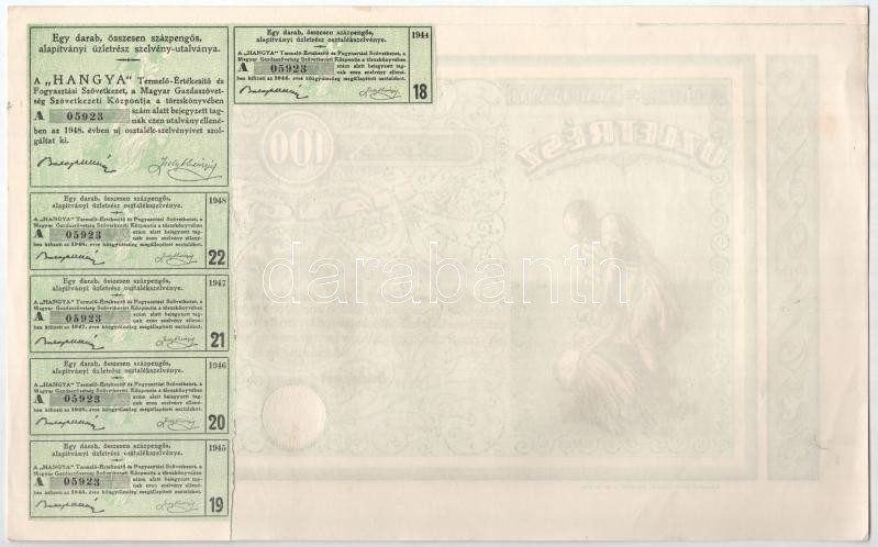 Beschreibung: Budapest 1928-1939. "Hangya Termelő-Értékesítő és Fogyasztási Szövetkezet" üzletrésze 100P-ről, szelvényekkel, szárazpecséttel (4x) T:I-,II egyiken anyaghiány