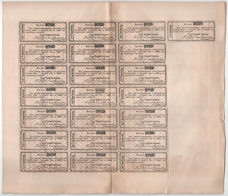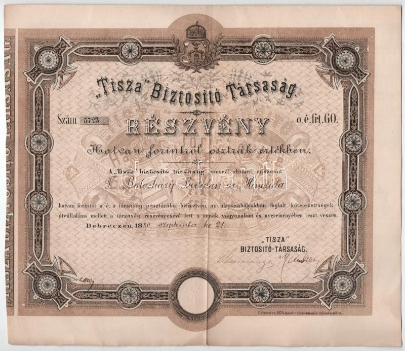 Debrecen 1880. "'Tisza' Biztosító Társaság" részvé... https://www.darabanth.com/de/436-Fernauktion/436.0/Numismatik/Aktien-und-Tickets~1500005/Debrecen-1880-Tisza-Biztosito-Tarsasag-reszvenye-60ft-rol-szelvenyekkel-szarazpecset~II2834462