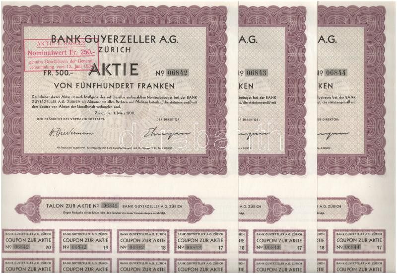 Switzerland / Zurich 1930. "Guyerzeller Bank" stock for 500 Frank, with coupons, stamp, consecutive serials (3x) C:AU,XF small corner drive