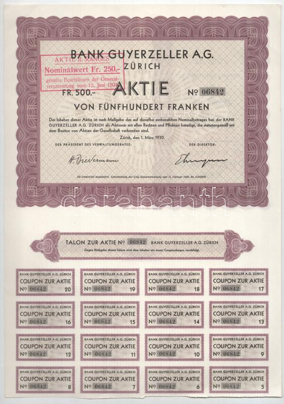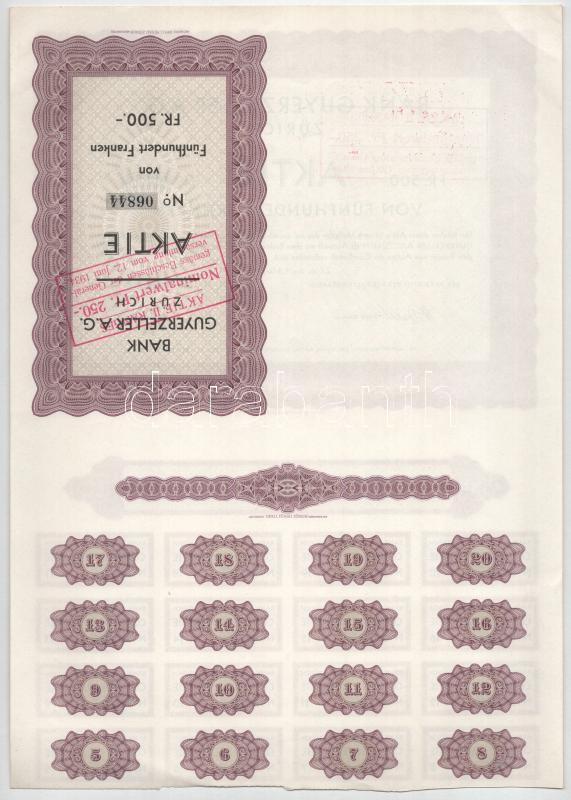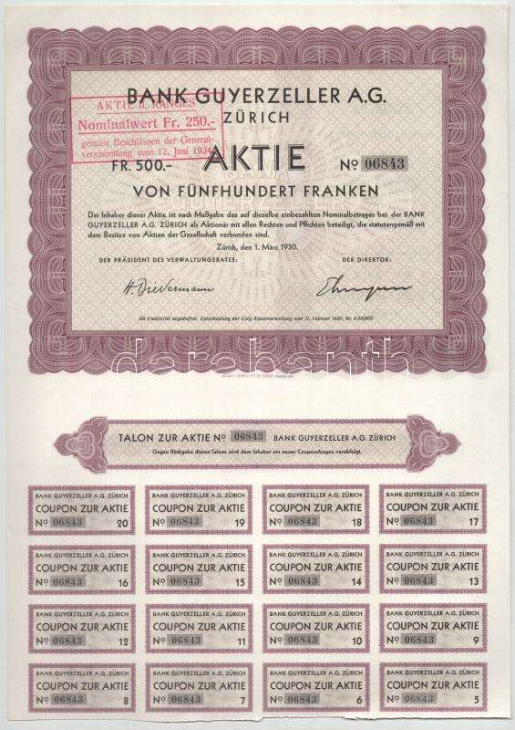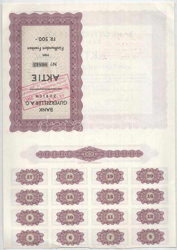 Beschreibung: Svájc / Zürich 1930. "Guyerzeller Bank" 500Fr-ról szóló részvénye szelvényekkel, pecsételéssel, sorszámkövetők (3x) T:I-,II kis sarokhajlás