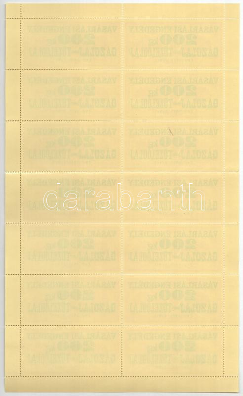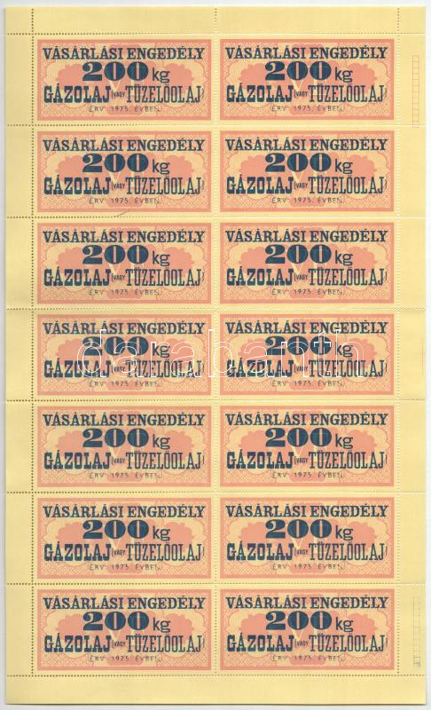 Beschreibung: 1975. "Vásárlási engedély - 200kg Gázolaj vagy Tüzelőolaj" (14x) bélyeg, teljes ív T:II