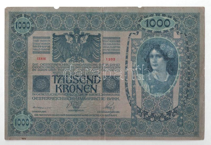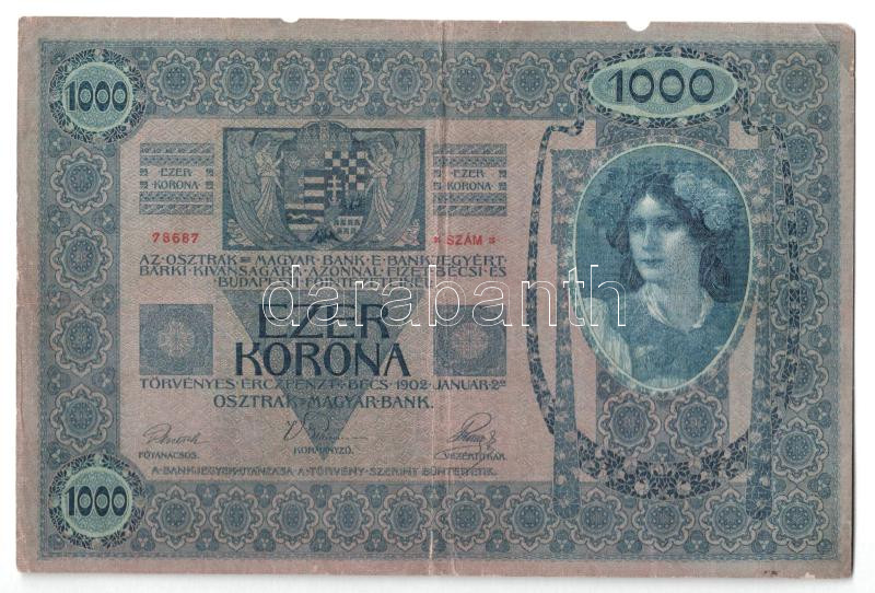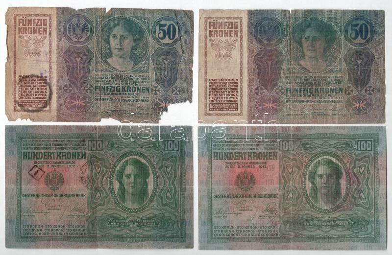 1902. 1000K + 1912. 100K (2x) az egyik piros "MAGYARORSZÁG" felülbélyegzéssel, a másik fekete, kiolvashatatlan felülbélyegzéssel + 1914. 50K (2x) az egyik cirill betűs felülbélyegzéssel T:III,III- szakadás, anyaghiány