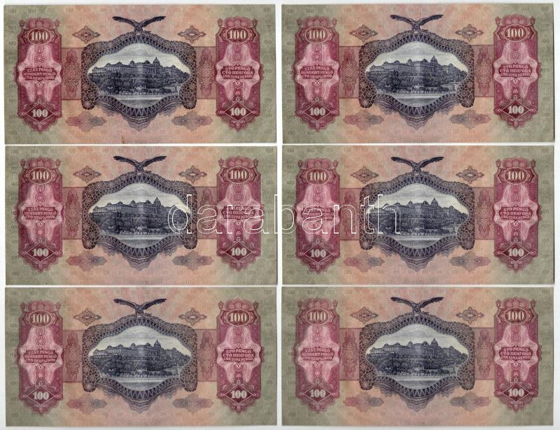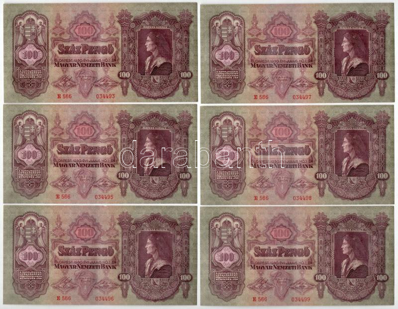 1930. 100P (6x) sorszámkövető és egy egyugrású sorszámmal "E 566 ... https://www.darabanth.com/de/436-Fernauktion/436.0/Numismatik/Ungarische-Banknoten~1500007/1930-100P-6x-sorszamkoveto-es-egy-egyugrasu-sorszammal-E-566-034493-E-566-034499-TII-~II2835434