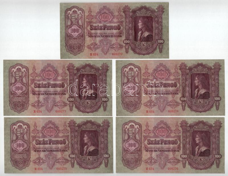 Beschreibung: 1930. 100P (7x) sorszámkövető és egyugrású sorszámmal "E 634 009269 - E 634 009276" T:II-III szép papír