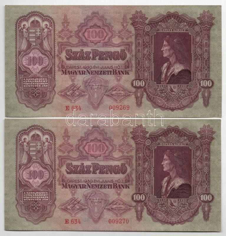 1930. 100P (7x) sorszámkövető és egyugrású sorszámmal "E 634 0092... https://www.darabanth.com/de/436-Fernauktion/436.0/Numismatik/Ungarische-Banknoten~1500007/1930-100P-7x-sorszamkoveto-es-egyugrasu-sorszammal-E-634-009269-E-634-009276-TII-III-~II2834191
