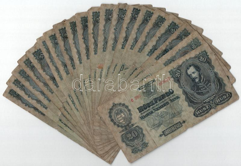 1930. 20P (20x) T:III-IV közte folt, szakadás, anyaghiány, az egyik ra... https://www.darabanth.com/de/436-Fernauktion/436.0/Numismatik/Ungarische-Banknoten~1500007/1930-20P-20x-TIII-IV-kozte-folt-szakadas-anyaghiany-az-egyik-ragasztva~II2835860