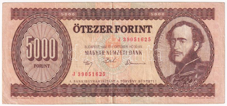 1992. 5000Ft "J 39051625" T:III Adamo F49 https://www.darabanth.com/de/436-Fernauktion/436.0/Numismatik/Ungarische-Banknoten~1500007/1992-5000Ft-J-39051625-TIII-Adamo-F49~II2829301