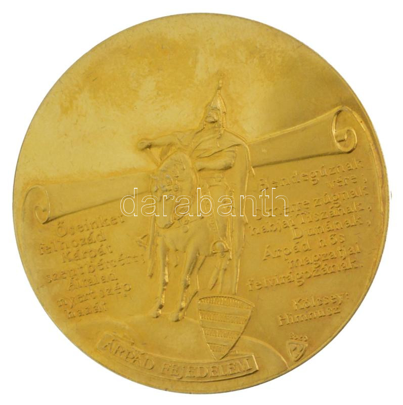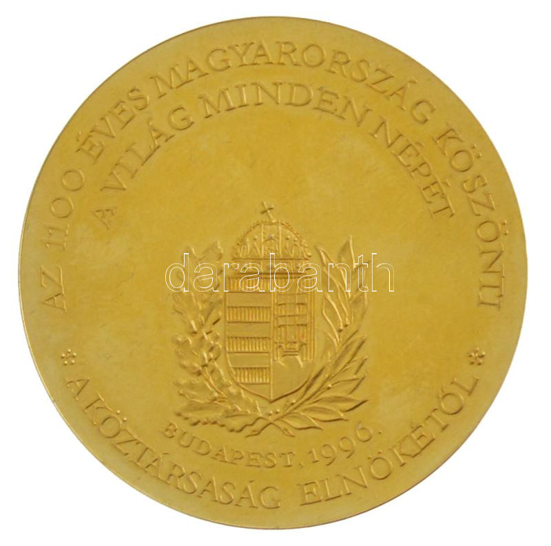 Bozó Gyula (1913-2004) 1996. "Honfoglalás" aranyozott Ag emlékérem "Az 1100 éves Magyarország köszönti a világ minden népét - A Köztársaság Elnökétől / Himnusz részlet" eredeti tokban, SZG peremjelzéssel (35.92g/0.925/42mm) T:1-