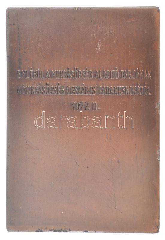 Kiss Nagy András (1930-1997) 1977. "De elvtársaim! Ez az a munkásság, mely osztályharcban vasba öltözött... / Emlékül a Munkásőrség alapító tagjának a Munkásőrség országos parancsnokától 1977. II." vörösréz emlékplakett (104,5x72mm) T:1-