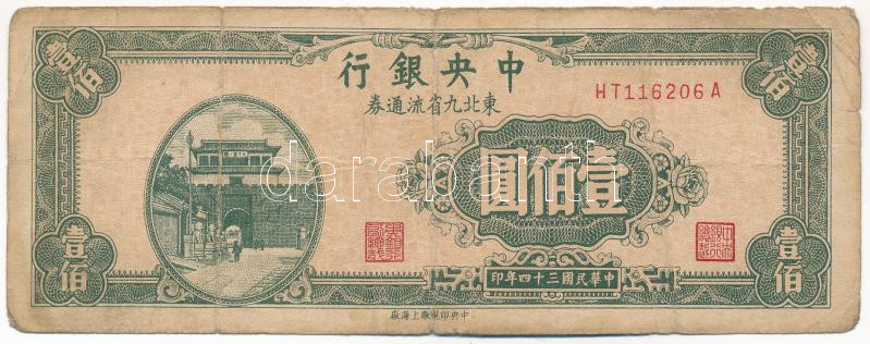 China 1945. 100 Yuan C:VG... https://www.darabanth.com/de/436-Fernauktion/436.0/Numismatik/Weltweit-Banknoten~2500001/Kina-1945-100Y-TIII-kis-szakadas-tulyuk-China-1945-100-Yuan-CVG-small-tear-needle-hole-K~II2825642