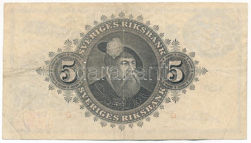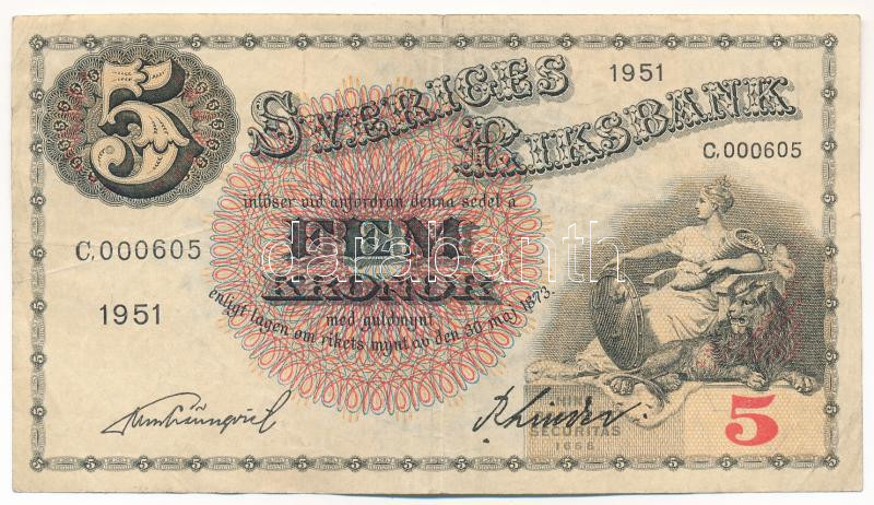 Sweden 1951. 5 Kronor ... https://www.darabanth.com/de/436-Fernauktion/436.0/Numismatik/Weltweit-Banknoten~2500001/Svedorszag-1951-5K-C-000605-TIII-Sweden-1951-5-Kronor-C-000605-CF-Krause-P2333ah~II2833564
