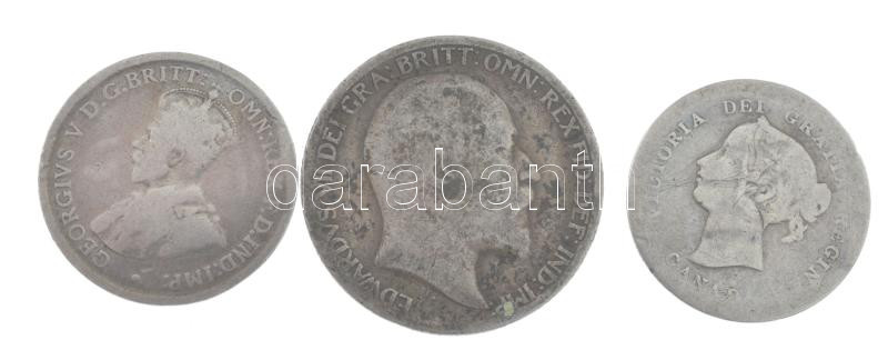 Kanada ~1858-1901. 5c Ag "Viktória" (1,05g) + Nagy-Britannia 1906. 6p Ag "VII. Eduárd" (2,67g) + Ausztrália 1918. 3p Ag "V. György" (1,35g) T:3 patina, hajlott Canada ~1858-1901. 5 Cents Ag "Victoria" (1,05g) + Great Britain 1906. 6 Pence Ag "Edward VII" (2,67g) + Australia 1918. 3 Pence Ag "George V" (1,35g)