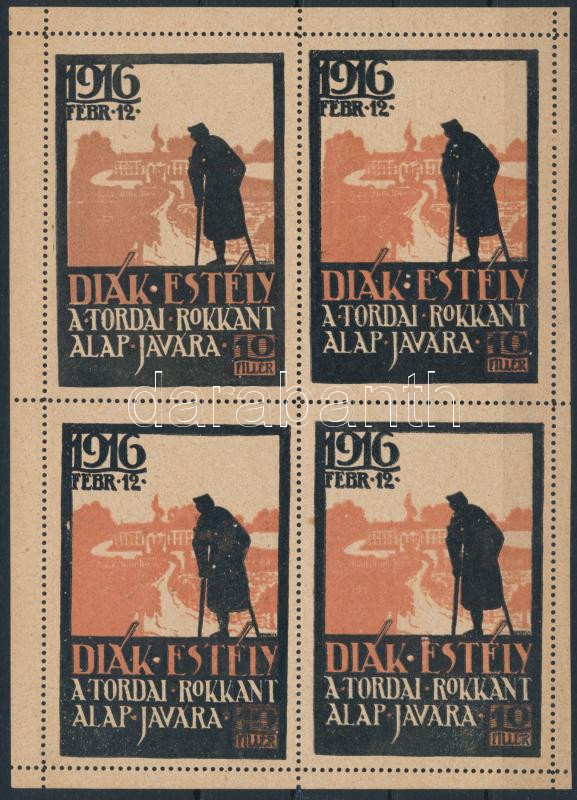 1916 Diák estély a tordai rokkant alap javára segélybélyeg négyestömb https://www.darabanth.com/de/436-Fernauktion/436.0/Philatelie-und-Postgeschichte-Ungarn/Paraphilatelie~500016/1916-Diak-estely-a-tordai-rokkant-alap-javara-segelybelyeg-negyestomb~II2826560