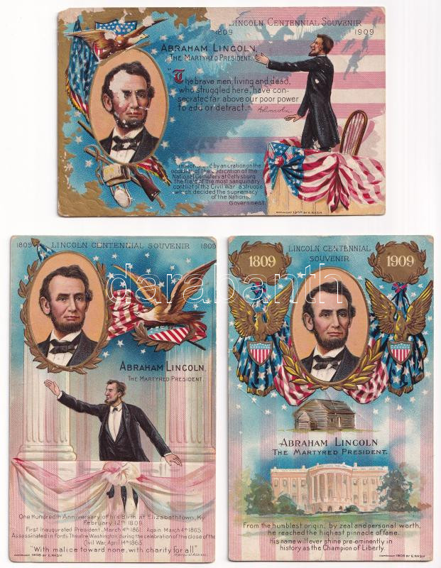 ABRAHAM LINCOLN - 3 db régi amerikai szecessziós dombornyomott képeslap vegyes minőségben / ABRAHAM LINCOLN - 3 pre-1945 American Art Nouveau, embossed litho postcards in mixed quality