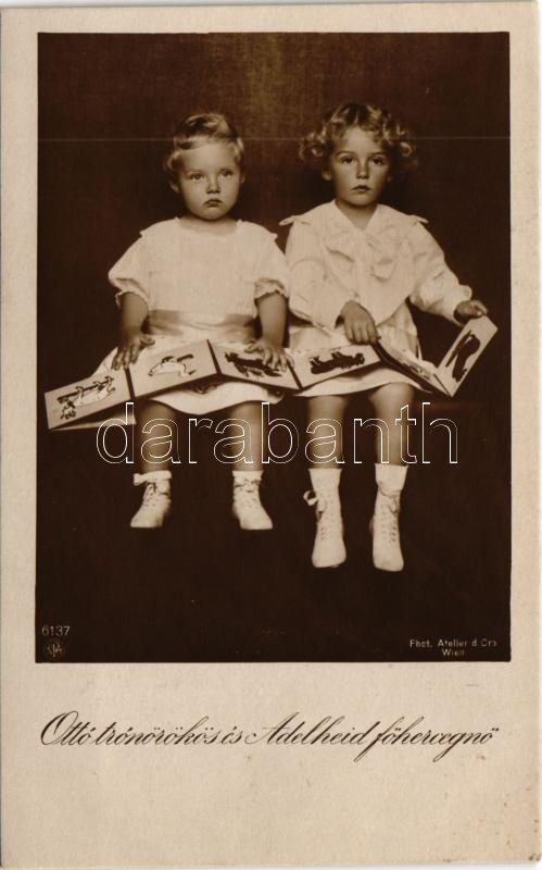 Ottó trónörökös és Adelheid főhercegnő. Phot. Atelier d'Ora 6137. https://www.darabanth.com/de/437-Fernauktion/437.0/Ansichtskarten/Herrscher-Politiker-Konigshauser~1500100/Otto-tronorokos-es-Adelheid-fohercegno-Phot-Atelier-dOra-6137~II2838974