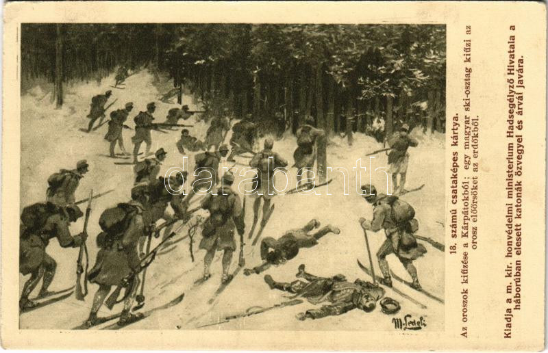 18. számú csataképes kártya. Az oroszok kiűzése a Kárpátokból: egy magyar ski osztag kiűzi az orosz előőrsöket az erdőkből. Kiadja a M. kir. Honvédelmi Minisztérium Hadsegélyező Hivatala / WWI Austro-Hungarian K.u.K. military, skiing soldiers chase the Russian soldiers out of the woods (EK)