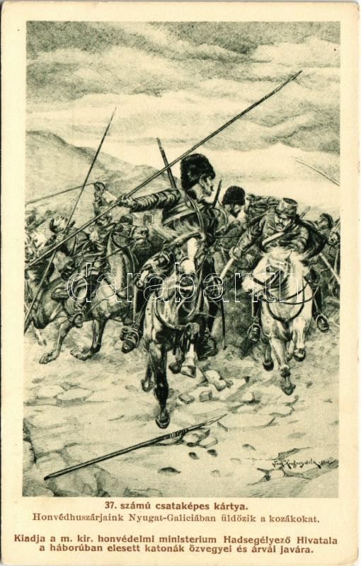 37. számú csataképes kártya. Honvéd huszárjaink Nyugat-Galíciában üldözik a kozákokat. Kiadja a M. kir. Honvédelmi Minisztérium Hadsegélyező Hivatala / WWI K.u.K. military, Austro-Hungarian hussars chasing the Cossacks