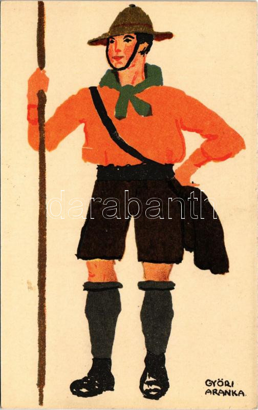 Cserkész művészlap. A fáradtságnak fittyet hányok: Diana sósborszeszt használok! / Hungarian boy scout art postcard. Advertisement on the backside s: Győri Aranka