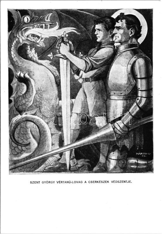 Szent György vértanú-lovag, a cserkészek védőszentje. Cordiale kiadása. Barcza nyomda / Hungarian boy scout art postcard, Saint George, the patron saint of scouts s: Márton L.
