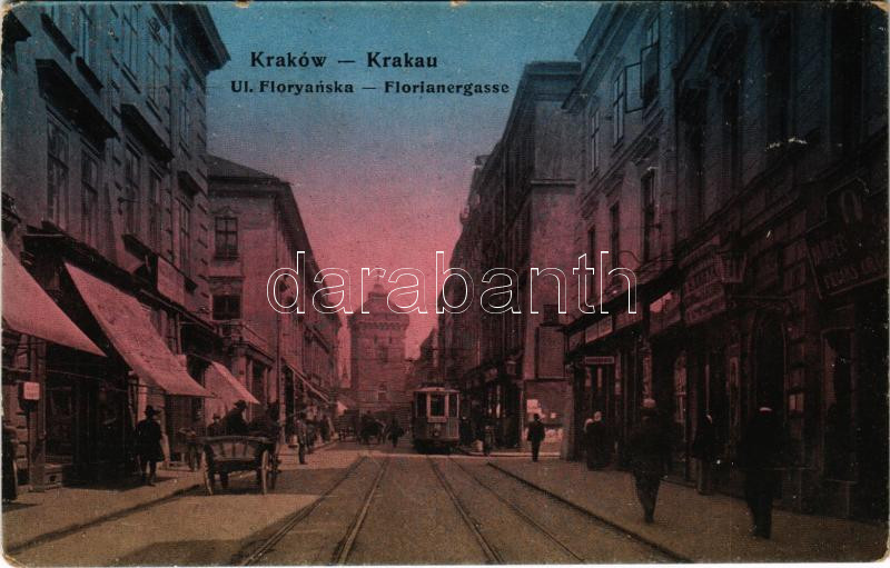 Kraków, Krakkó, Krakau; Ul. Floryanska / Florianergasse / street, tram... https://www.darabanth.com/de/437-Fernauktion/437.0/Ansichtskarten/Polen~1500063/Krakow-Krakko-Krakau-Ul-Floryanska-Florianergasse-street-tram-shops~II2841649