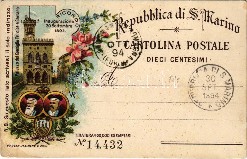 Beschreibung: 1892 (Vorläufer!!!) San Marino, Palazzo del Consiglio Principe e Sovrano. Ricordo Inaugurazione 30 Settembre 1894. Art Nouveau, floral, litho (EK)