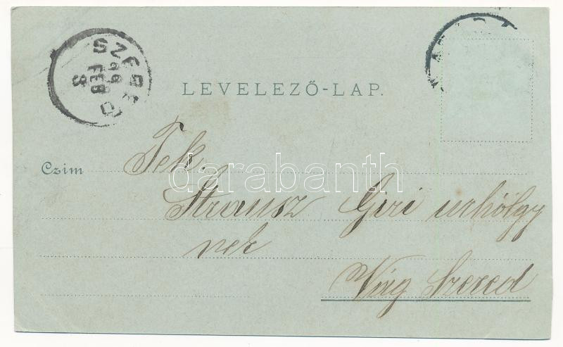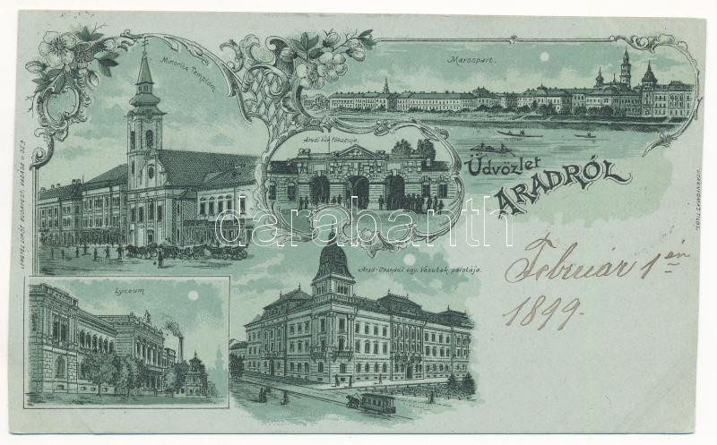 1899 (Vorläufer) Arad, Minorita templom, vár főkapuja, Maros-part, Lyceum, Arad-Csanádi egy. Vasutak palotája, lóvasút. Lengyel Lipót kiadása / Minorite church, castle gate, Mures riverside, grammar school, railway palace, horse-drawn tram. Art Nouveau, floral, litho (vágott / cut)
