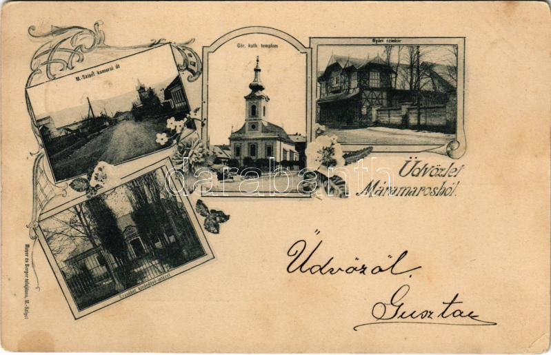 1899 (Vorläufer) Máramarossziget, Sighetu Marmatiei; Kamarai út, Görög katolikus templom, Nyári színkör, Erzsébet kisdedóvó intézet. Mayer és Berger tulajdona / street, church, theatre, kindergarten. Art Nouveau, floral (EK)
