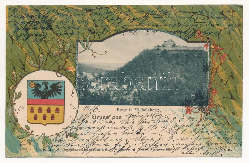 Beschreibung: 1902 Kisdisznód, Michelsberg, Cisnadioara; Burg / Vár. Szecessziós címeres litho keret, G.A. Seraphin, Jos. Drotleff / castle. Art Nouveau, floral litho frame with coat of arms (EK)