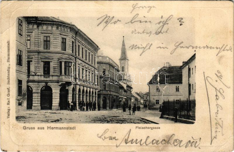 1903 Nagyszeben, Hermannstadt, Sibiu; Fleischergasse / utca. Karl Grae... https://www.darabanth.com/de/437-Fernauktion/437.0/Ansichtskarten/Siebenburgen~1500006/1903-Nagyszeben-Hermannstadt-Sibiu-Fleischergasse-utca-Karl-Graef-kiadasa-street-szakadas~II2837598