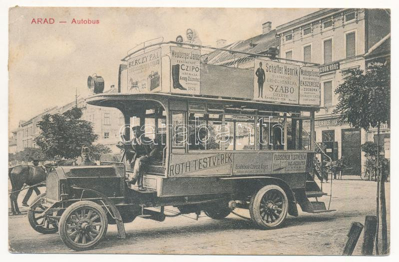 1909 Arad, Autóbusz Weinberger János, Berczy Pál, Schaffer Henrik, Rot... https://www.darabanth.com/de/437-Fernauktion/437.0/Ansichtskarten/Siebenburgen~1500006/1909-Arad-Autobusz-Weinberger-Janos-Berczy-Pal-Schaffer-Henrik-Roth-Testverek-Fleischer-Tes~II2848181