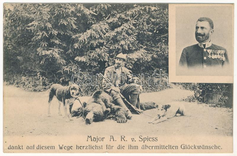 1909 Nagyszeben, Hermannstadt, Sibiu; Major A.R. v. Spiess dankt auf diesen Wege herzlichst für die ihm übermittelten Glückwünsche / August Roland von Spiess Osztrák-Magyar Monarchia ezredese, román királyi fővadász, vadászíró elejtett medvével. Hátoldalon saját levele / K.u.k. military officer, writer, famous hunter and Hunting Master for the Romanian royal court, hunted bear. His own letter on the backside (r)