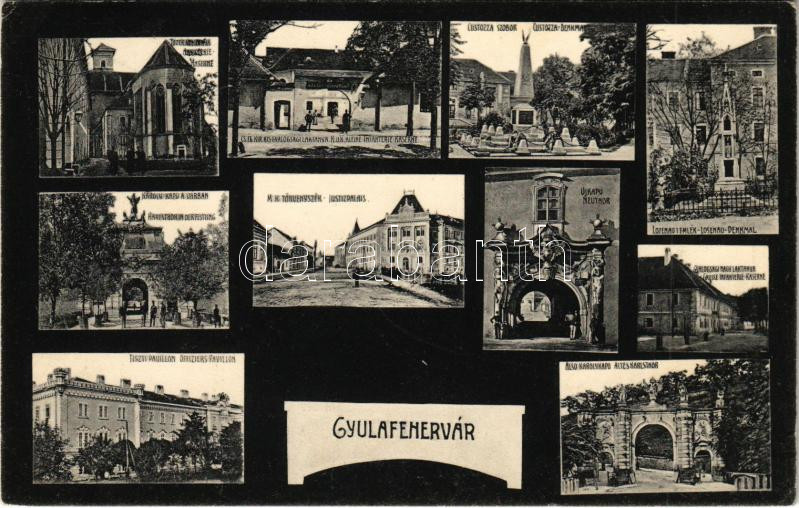1910 Gyulafehérvár, Karlsburg, Alba Iulia;Cs. és kir. gyalogsági laktanya, Custozza szobor, Lozenau emlékmű, Károly-kapu a várban, K.u.K. katonák, Törvényszék, Újkapu, Tiszti pavilon, Tüzérlaktanya. Petri F. Vilmos kiadása / K.u.K. military infantry and artillery barracks, monuments, castle gates, K.u.K. soldiers, court, officers' pavilion (EK)