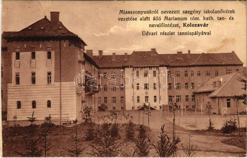 1919 Kolozsvár, Cluj; Miasszonyunkról nevezett szegény iskolanővérek vezetése alatt álló Marianum római katolikus tan- és nevelőintézet, udvari részlet, intézeti teniszpálya / girls boarding school, tennis court (EK)