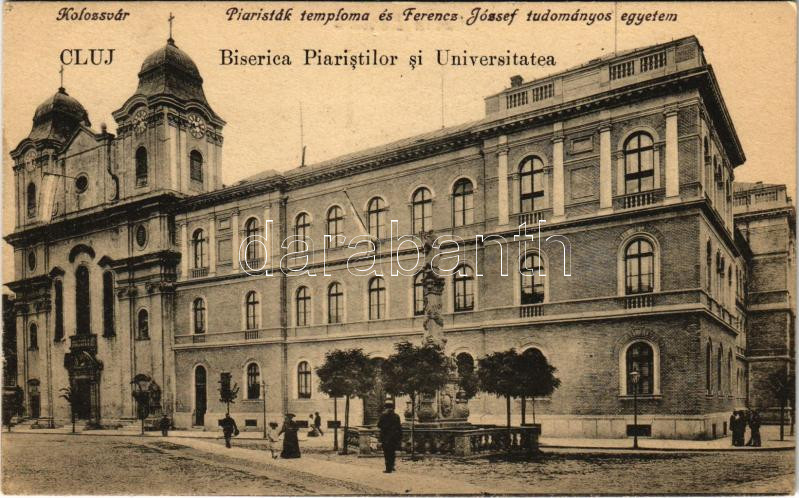1940 Kolozsvár, Cluj; Piaristák temploma és Ferenc József tudományos egyetem. Vasúti levelezőlapárusítás 65. 1918. / Biserica Piaristilor si Universitatea / church and university + "1940 Kolozsvár visszatért" So. Stpl (EK)